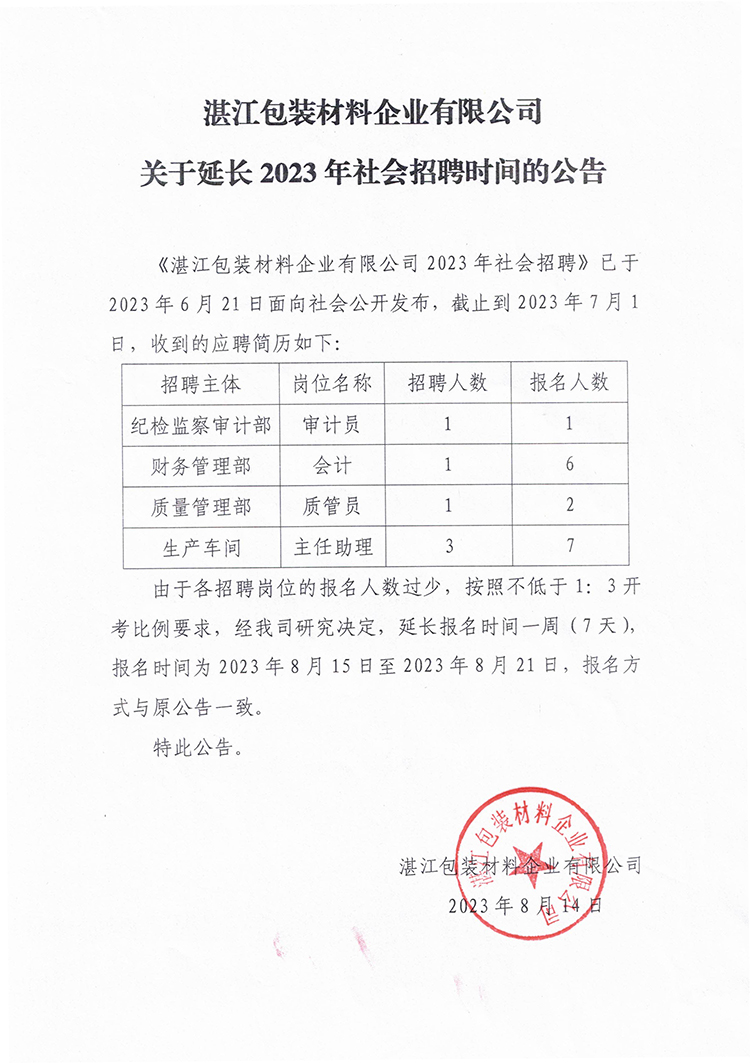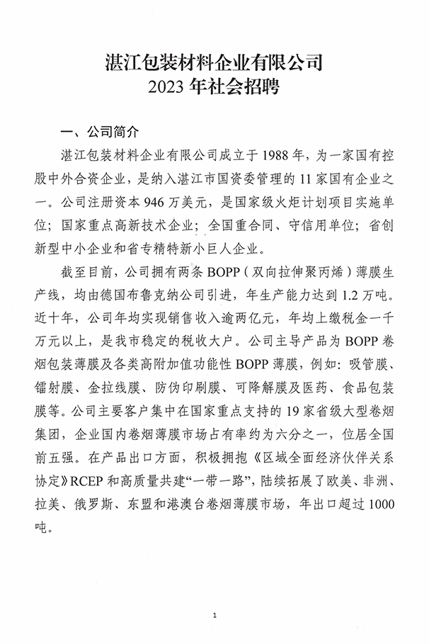 附:湛江包裝材料企業(yè)有限公司2023年社會招聘↓